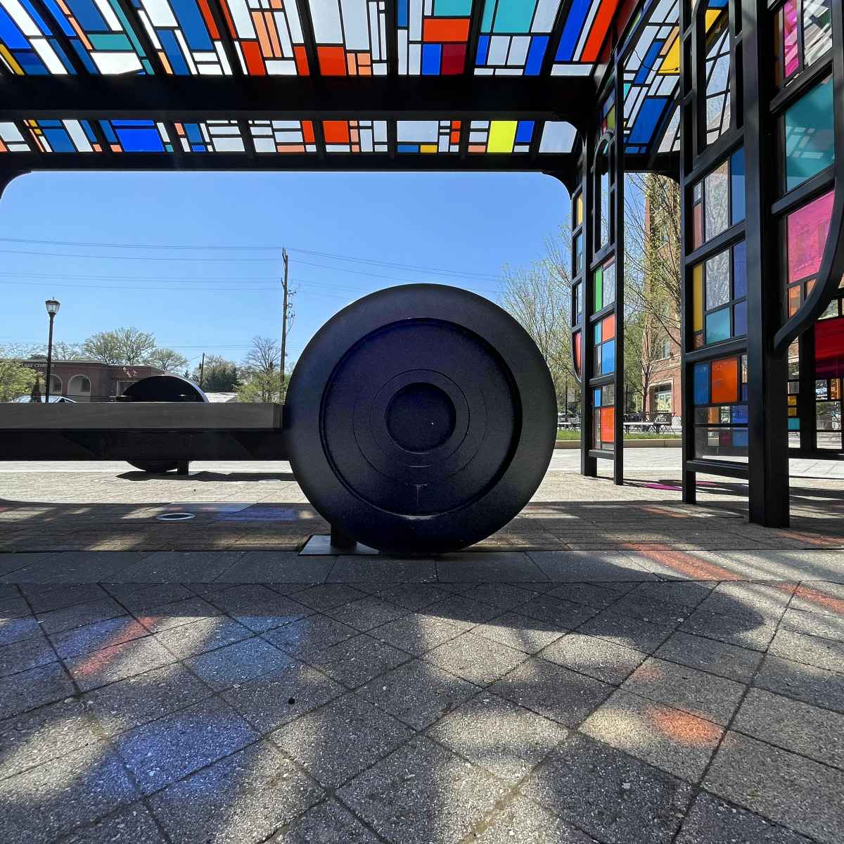 The Streetcar is a sculptural seating area with trolley wheels forged from steel and colored acrylic panels creating a Mondrian-style roofline. The panels catch sunlight and punctuate shadows with rainbow patterns. Sit a minute on the plaza, enjoy the warm afternoon!