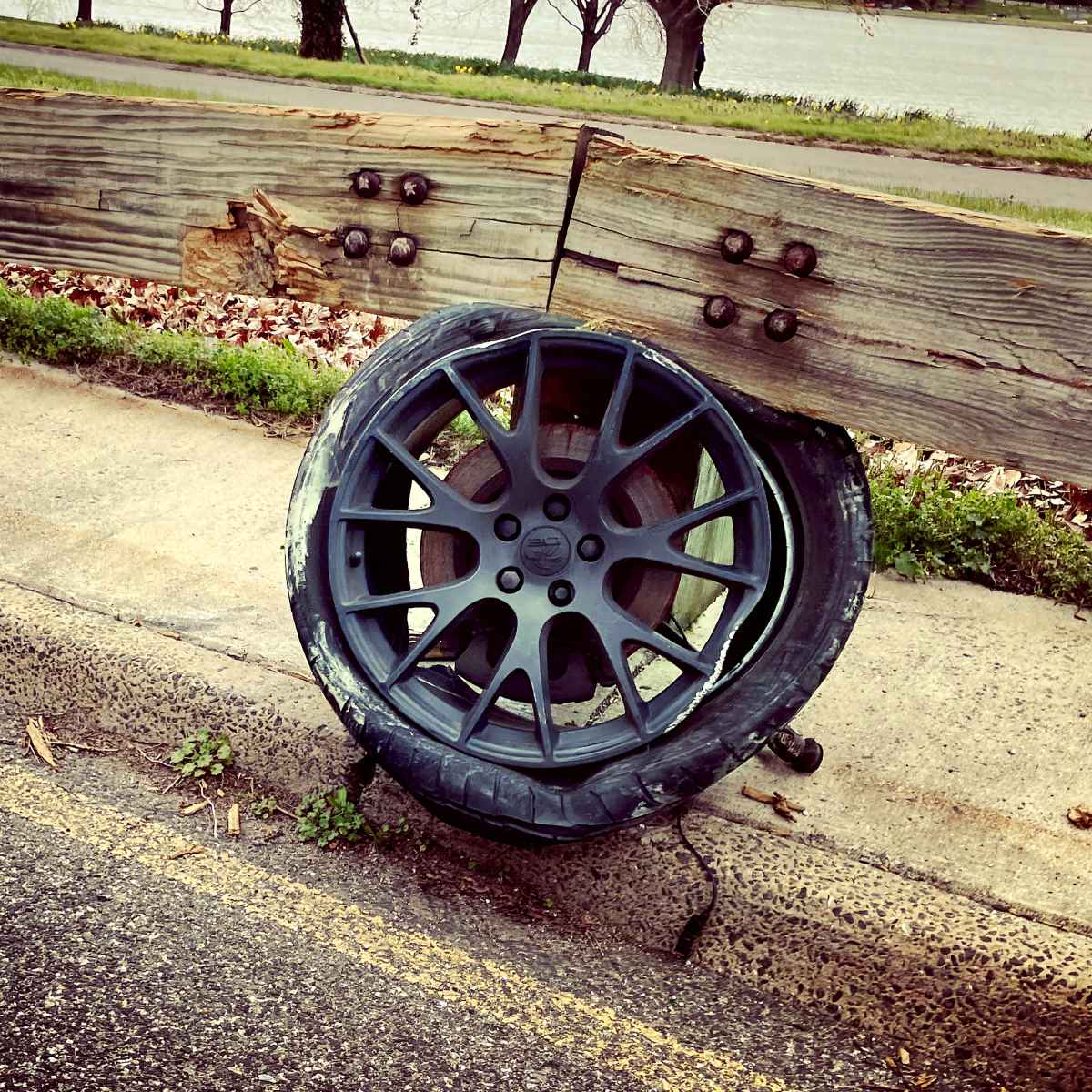 Stuck in slow crawling traffic on the Parkway, it's ironic to see a crazy, blasted wheel lodged into a wooden guardrail. How fast was that car going to get so permanently embedded? Clearly the car wreckage is long gone, and yet the Round remains.