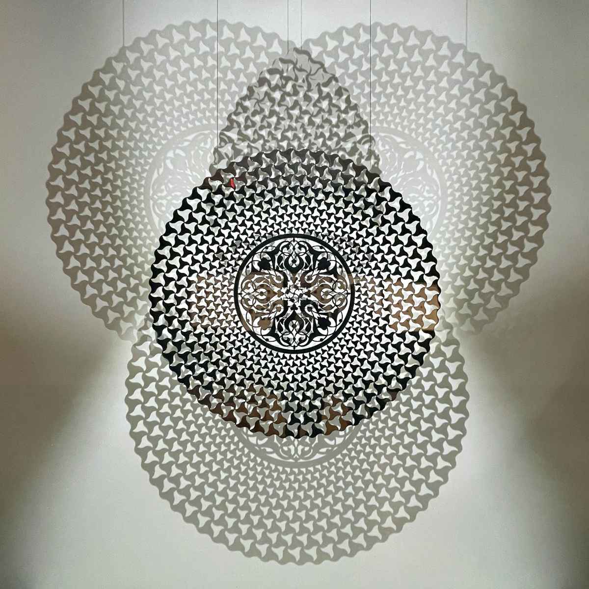 The patterns in this cut-steel piece are inspired by tiles at the Alhambra in Granada, Spain. They also resemble a swirling flock of migrating birds, which are echoed in the piece's layered shadows.