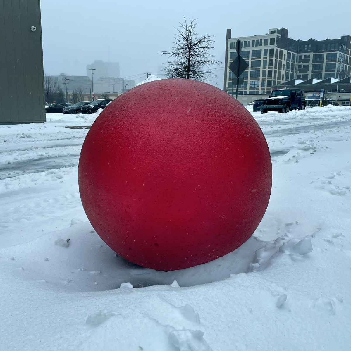 Snow removal can get accomplished all kinds of ways — with shovels, scoopers and scrapers of all sizes, ploughs attached to pick-ups and garbage trucks, loaders, backhoes and bulldozers. Wonder how a giant red bowling ball might clear the parking lot?