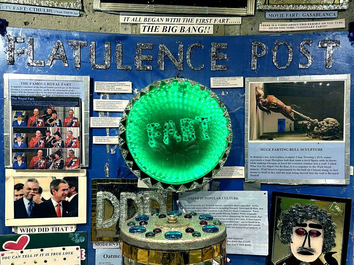 Art museums display collections of paintings, sculptures and installations that can be beautiful, inspiring, and very often serious. Humorous? Irreverent? You bet! In the lower level gallery at the American Visionary Art Museum in Baltimore, MD is a work that’s both artsy and fartsy! “Flatulence Post” presents an interactive assemblage of books, news clippings, historical stories, whimsical quotes, pictures, drawings and paintings as a mirror of fart humor throughout the ages. If the collage isn’t enough to look at, you can also step on the console and be serenaded by 60 different fart sounds. But if you smell something… that’s not the art.
