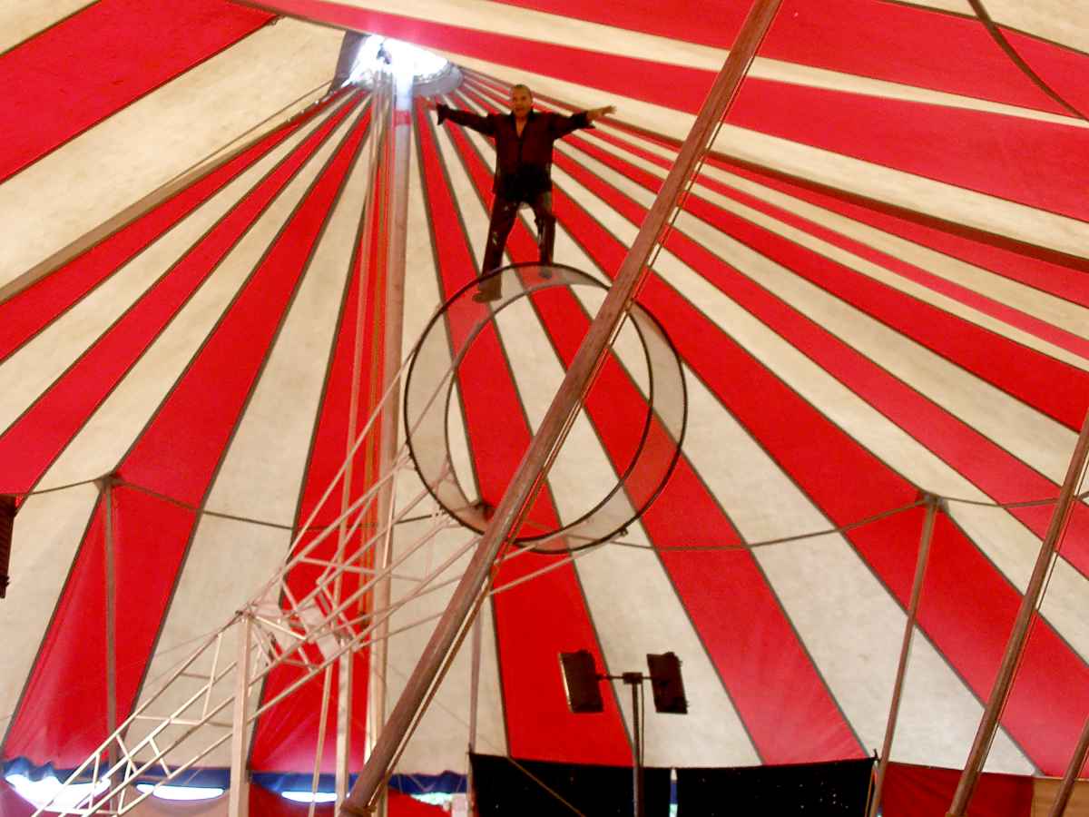 Any good traveling circus will have an animal act, a creepy clown or two, and some feats of daring do. The Death Ring offers this stunt walker the challenge to revolve around the big top in 30 foot swings, every rotation a heart-stopper.